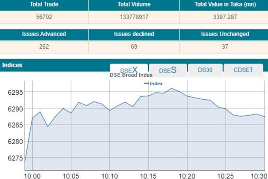 Following the previous day’s marginal gain, DSEX, the prime index of the Dhaka Stock Exchange (DSE), went up by 14.99 points or 0.24 per cent to stand at 6,288 within the first 30 minutes of trading at 10:30 am.