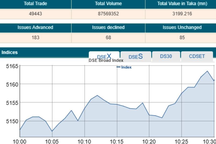 DSEX, the prime index of the DSE, went up by 34.15 points or 0.67 per cent to reach 5,167 points at 10:30 am.