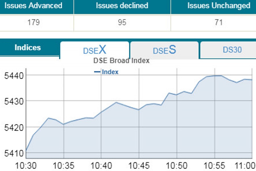 DSEX, the prime index of the DSE, went up by 23.17 points or 0.42 per cent to stand 5,433 points at 11:00am.