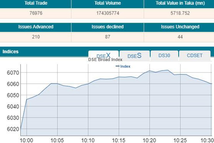 Following the previous day’s marginal gain, the market opened higher and the DSEX, the prime index of the Dhaka Stock Exchange (DSE), went up by 42.15 points or 0.70 per cent to reach 6,061 within the first 30 minutes of trading when the report was filed at 10:30 am.