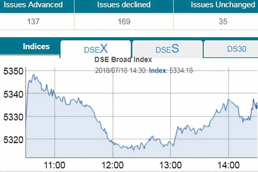 Of the total 341 issues traded on the DSE trading floor, 169 closed lower, 137 higher and 35 issues remained unchanged.