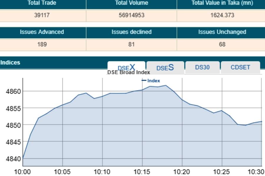 DSEX, the prime index of the DSE, went up by 6.46 points or 0.13 per cent to reach 4,846 points at 10:30am.