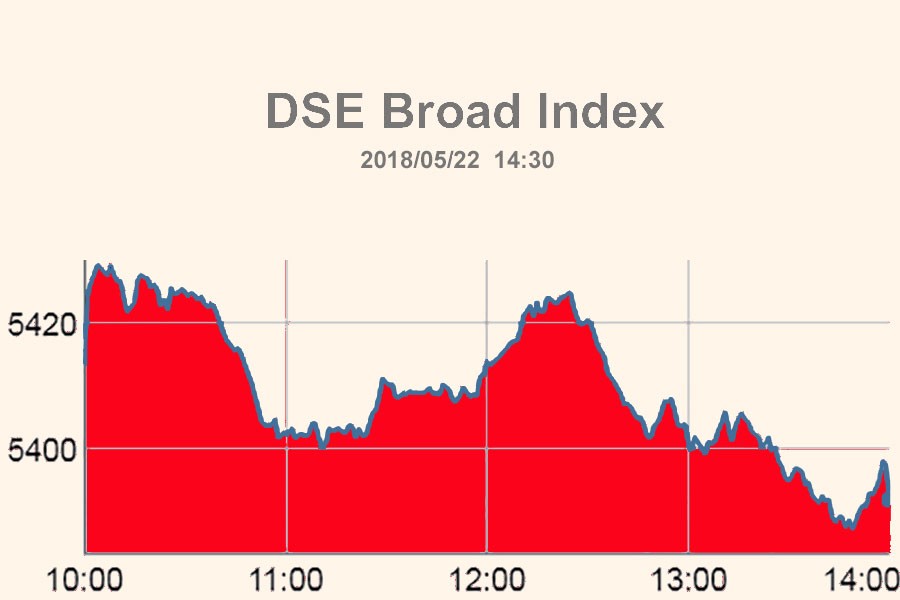 DSEX, core index of Dhaka Stock Exchange (DSE), went down by 21.39 points or 0.39 per cent to settle at 5,391 points.