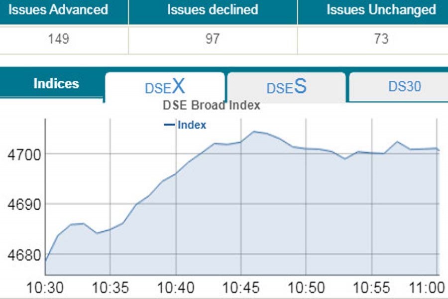 DSEX, the prime index of the DSE, went up by 21.60 points or 0.46 per cent to stand at 4,699 points at 11:00am.