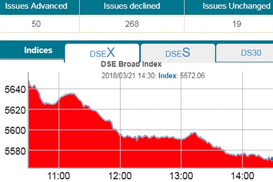 Finally, DSEX, the benchmark index of the DSE, went down by more than 76 points or 1.36 per cent to settle at 5,572, the lowest level since June 21, 2017.