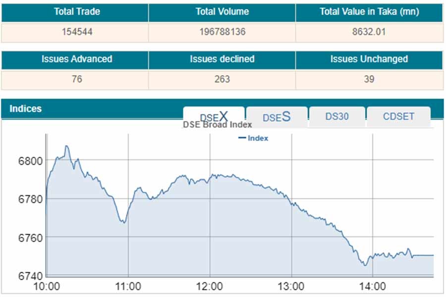 Finally, DSEX, the key index of the Dhaka Stock Exchange (DSE), went down by 21.25 points or 0.31 per cent to settle at 6,750, after gaining over 79 points in the previous session.