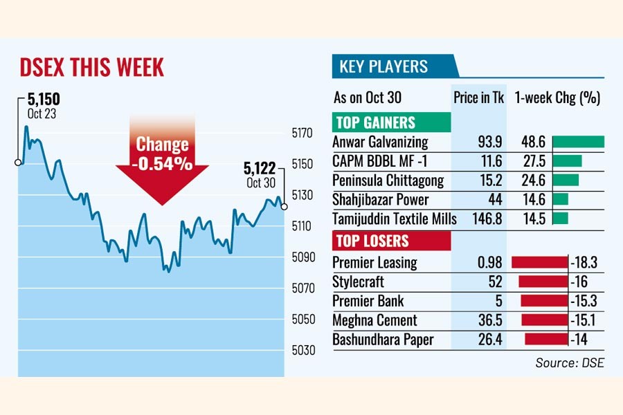 The DSEX, the prime index of Dhaka Stock Exchange, finally settled the week 28 points, or 0.54 per cent, lower at 5,122, after recovering 30 points in the week before.