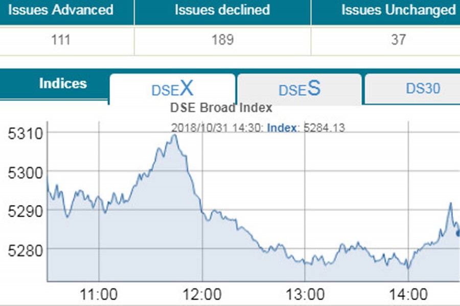 At the end of the session, DSEX, the benchmark index of the Dhaka Stock Exchange (DSE), went down by 14.94 points or 0.28 per cent, closing the day at 5,284.