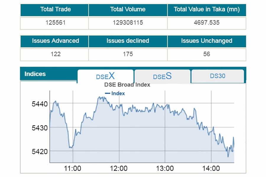 After witnessing volatility throughout the session, DSEX, the prime index of the Dhaka Stock Exchange (DSE), settled at 5,421, shedding 8.42 points or 0.15 per cent over the previous session.