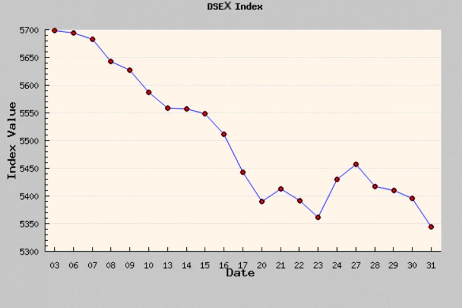 DSEX, the benchmark index of the DSE, settled at 5,343 on Thursday, losing 51.87 points or 0.96 per cent over the previous day.