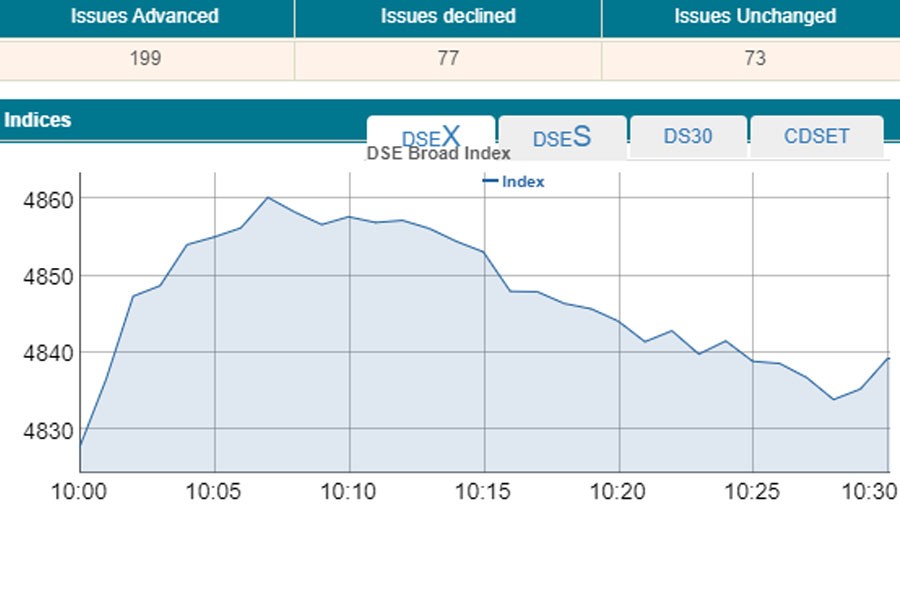 DSEX, the prime index of the DSE, went up by 11.63 points or 0.24 per cent to reach at 4,839 points at 10:30am.