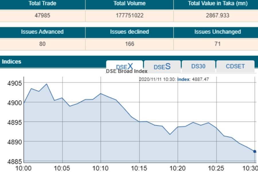 DSEX, the prime index of the DSE, went down by 10.84 points or 0.22 per cent to reach 4,888 points at 10:30am.