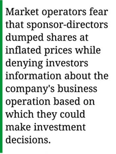 Market operators fear that sponsor-directors dumped shares at inflated prices while denying investors information about the company's business operation based on which they could make investment decisions.