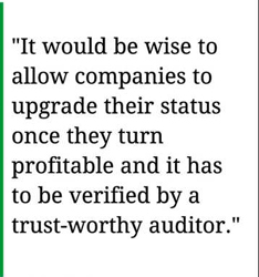 Mr Khan said, "It would be wise to allow companies to upgrade their status once they turn profitable and it has to be verified by a trust-worthy auditor."