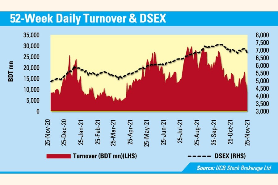 Dhaka bourse on Thursday saw another sharp loss in the broad index along with featuring a seven-month low turnover as downward trend persisted amid selling pressure executed by jittery investors.