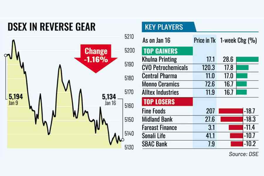DSEX, the key index of the Dhaka Stock Exchange (DSE), finally settled the week 60.5 points or 1.16 per cent lower at 5,134. The DSEX shed almost 66 points in the past two straight weeks.