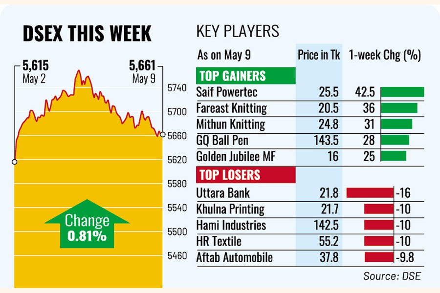 The DSEX, the benchmark index of the Dhaka Stock Exchange (DSE), finally settled more than 45 points or 0.81 per cent higher at 5,661. The DSEX added almost 80 points in the past two consecutive weeks.