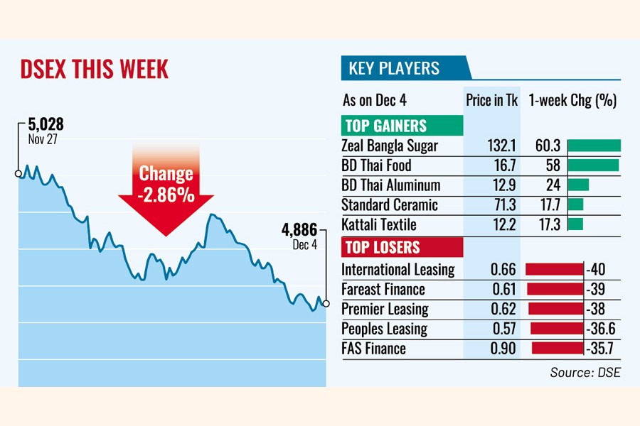 The prime DSEX index finally settled the week 142 points or 2.86 percent lower at 4,886, after recovering 325 points in the past two consecutive weeks.