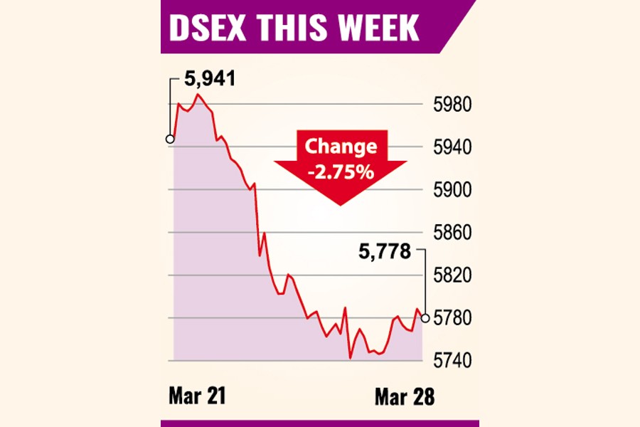 The benchmark DSEX index finally settled 163 points or 2.75 per cent lower at 5,778. This marked the biggest weekly fall in less than two months.