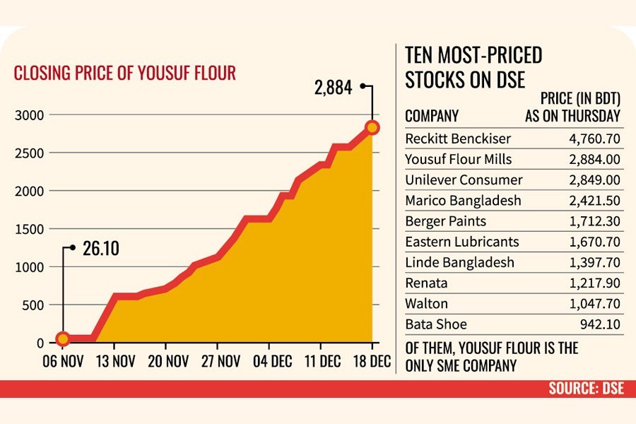 Yusuf Flour Mills, which returned to the SME Platform of Dhaka Stock Exchange (DSE) five months back after remaining in the over-the-counter market for a decade, became the second highest-priced stock in the capital market.