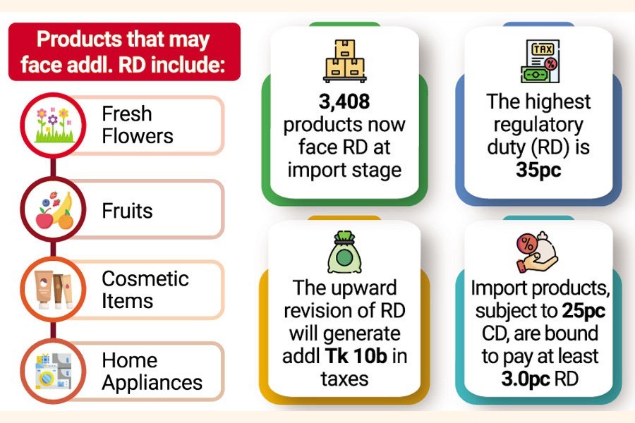 As per estimation of the NBR, the upward revision of RD would generate an additional amount of Tk 10 billion in taxes from imports of those products.