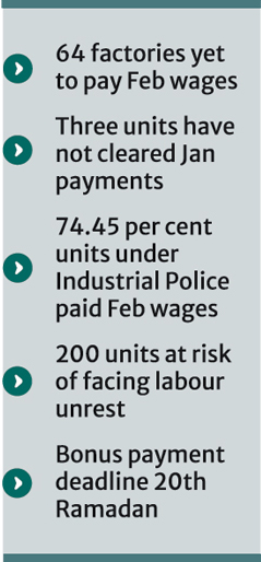 According to data, out of the 2,107 BGMEA-listed factories, some 64 are yet to pay February wages, while three have not cleared even January payments.