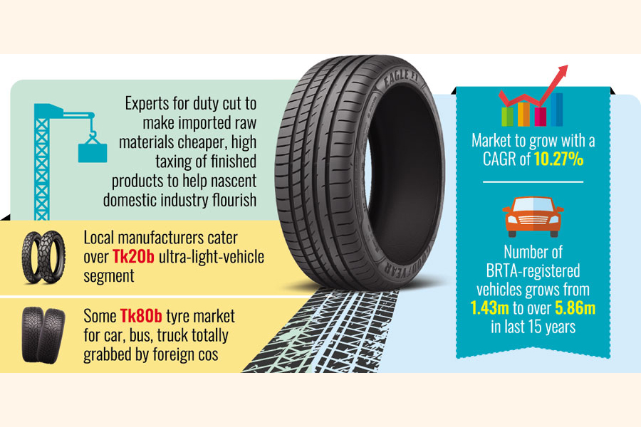 Experts feel that as Bangladesh lacks raw materials for tyres, it should be made cheaper to the manufacturers by reducing import duty.