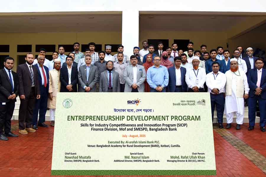 Al-Arafah Islami Bank has organized a month-long special training workshop to promote sustainable development of entrepreneurs and the Small and Medium Enterprises (SME) sector. The workshop is being held at the Bangladesh Rural Development Academy (BARD) in Cumilla with the overall support from the Sustainable Inclusive Credit Project (SICIP) under the Ministry of Finance and the SME Special Program Department (SMESPD) of Bangladesh Bank.