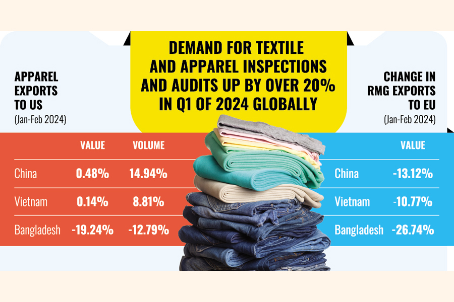 Global demand for textile and apparel inspections and audits from garment- manufacturing countries, including Bangladesh, increased over 20 per cent in the first quarter of 2024, according to QIMA latest report.