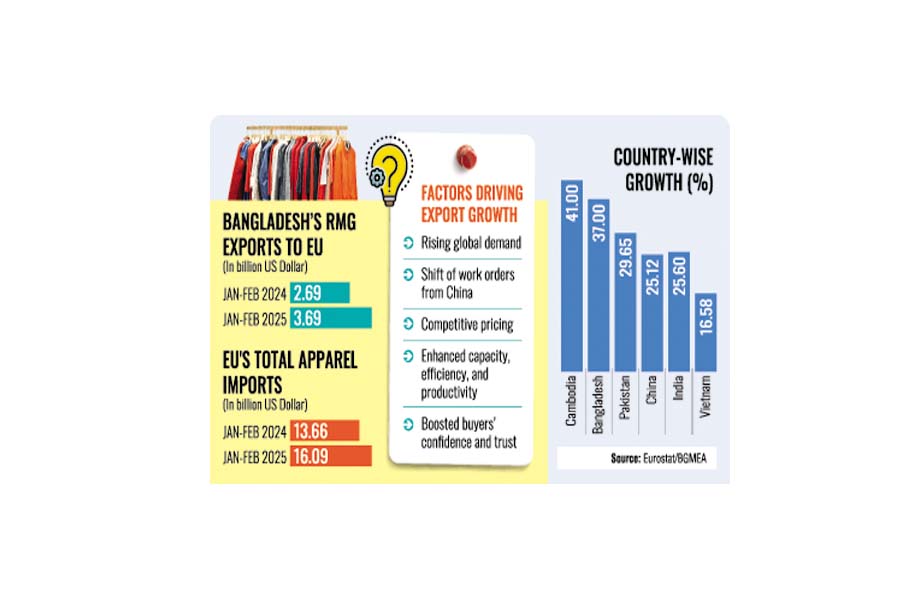 Bangladesh's readymade garment exports to the European Union (EU) recorded a robust 37-percent growth during January-February period of 2025, staying ahead of the major competitors like China, Vietnam, Turkey, and India.