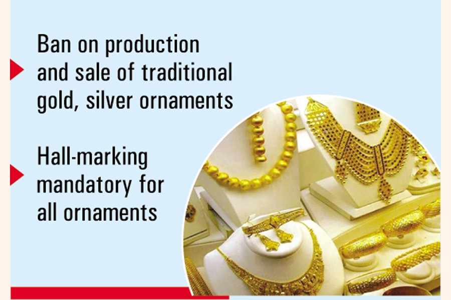 The Bangladesh Jewellers' Association (BAJUS) has imposed a complete prohibition on the manufacture and sale of traditional gold and silver ornaments. The association said only 18, 21, 22, and 24 carat ornaments crafted using the cadmium method will be permitted for production and sale.