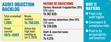 Of the total 1,206 pending issues, 936 cases involving Tk 367.82 billion have been classified as Serious Financial Irregularities (SFI) and some 234 as Non-SFI (non-serious) objections, involving more than Tk 378.69 billion.
