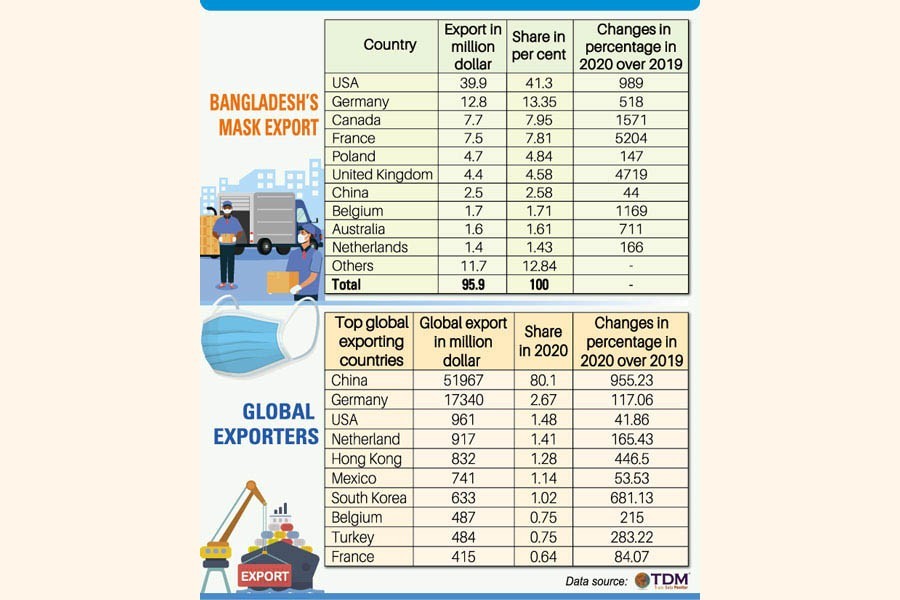 Bangladesh mostly exported surgical and KN95 masks worth nearly $40 million to the USA market during the January-November period. The exports to the US accounted for over 41 per cent of the total shipment while Germany became the second biggest importing country of the Bangladeshi product, according to the TDM.
