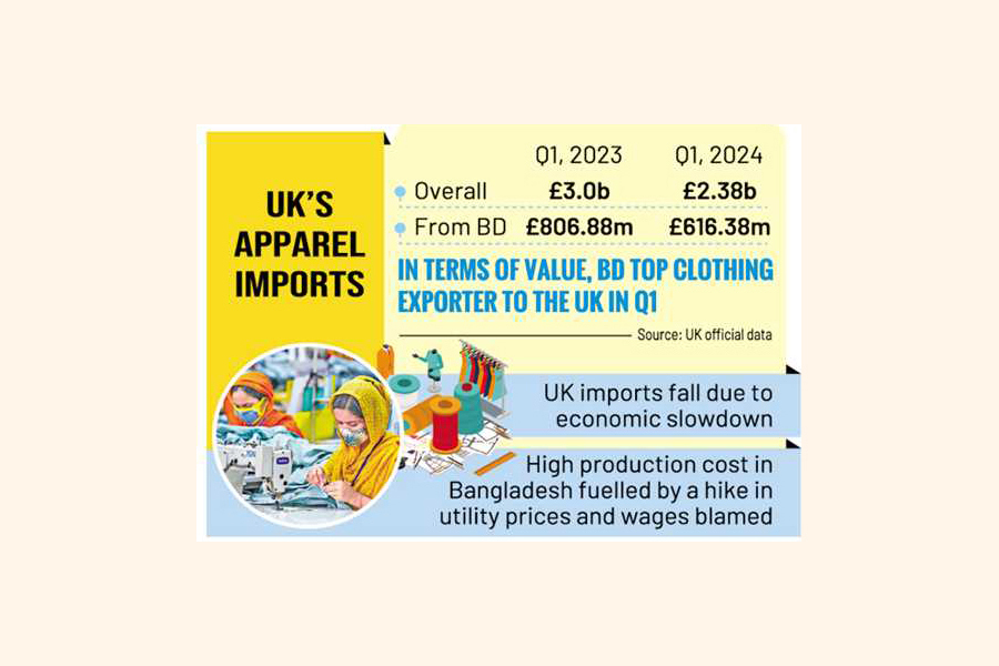 Bangladesh's ready-made garment (RMG) export to the United Kingdom has witnessed double-digit year-on-year negative growth during the first quarter of the current calendar year of 2024.