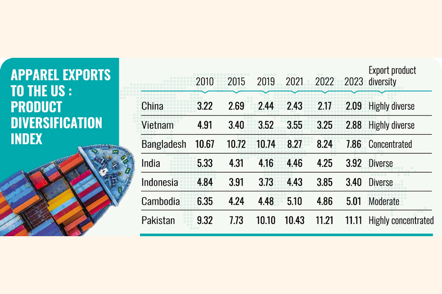 The analysis classifies Bangladesh's apparel export diversity to the US as "concentrated", while key competitors China, India, Vietnam, Indonesia and Cambodia receive better grades: ranging from "moderate" to "highly diverse".