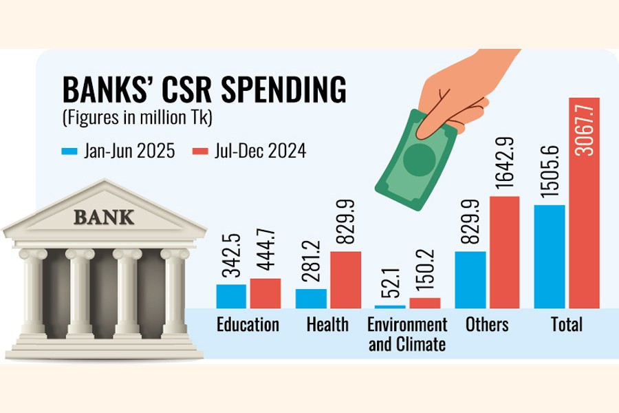 During the January-June period, banks spent over Tk 1.50 billion on CSR activities, while the expenditure had stood at nearly Tk 3.07 billion during the preceding half year, marking a decline of about Tk 1.57 billion.