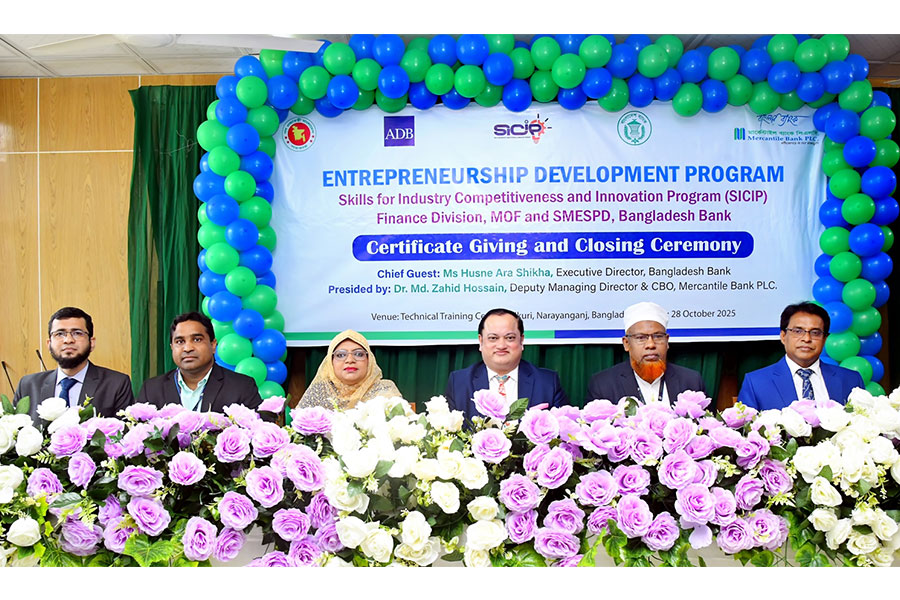 With the finance of Asian Development Bank (ADB), supervision of Bangladesh Bank and initiative of the Ministry of Finance, Mercantile Bank organized the certificate giving and closing ceremony of month-long Entrepreneurship Development Program as part of the ‘Skills for Industry Competitiveness & Innovation Program (SICIP)’.