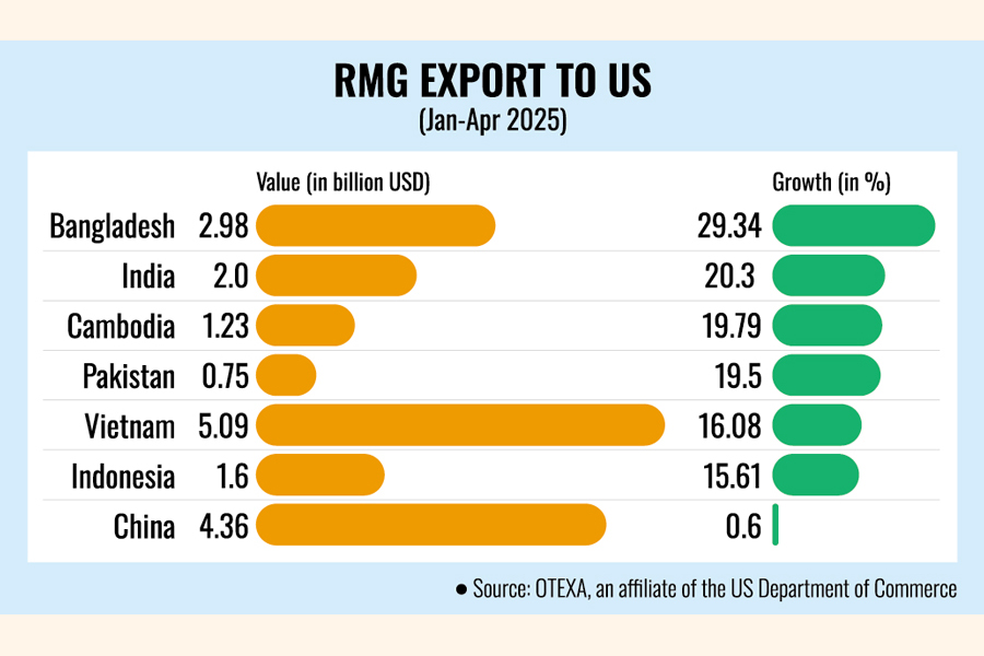 Bangladesh emerged as the fastest-growing apparel exporter to the United States with the highest 29.34-percent year-on-year growth among its major peers during the first four months of 2025.