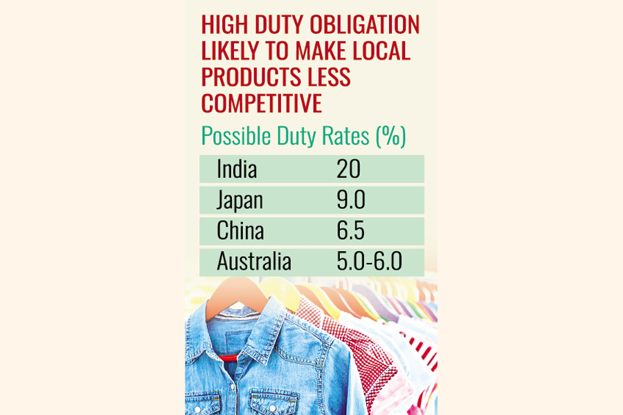 According to a latest study finding, Bangladeshi made RMG would face as high as 20 per cent duty in India while the rate would be 9.0 per cent for Japan - two most growing markets for the country's apparel items.