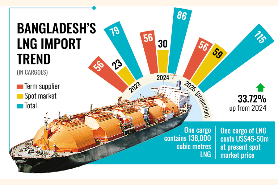 A senior Petrobangla official said state-run Petrobangla has planned to import a total of 115 LNG cargoes -- 59 from spot market and 56 from long-term suppliers, which marks a 33.72 per cent increase compared to that of the previous year.