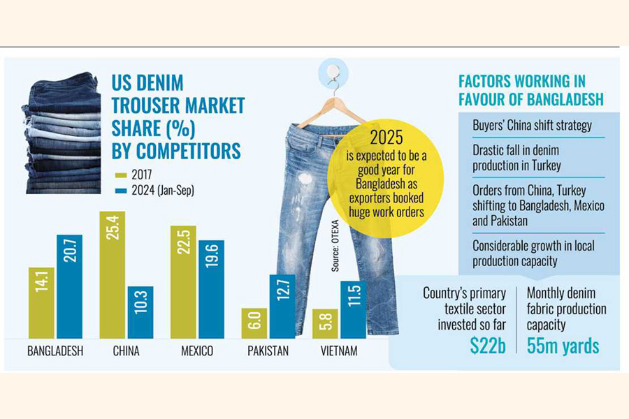 Bangladesh's share in the US denim trousers markets has witnessed a significant rise in the last seven years despite a gradual shrinking of the overall denim market there.