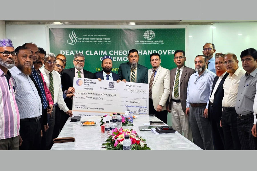 Bengal Islami Life Insurance Limited has handed over a check of BDT. 11,00,000 (Eleven Lac) only to South Asia Insurance Co. Ltd. as death benefit following the death of its Additional Managing Director, late Md. Emdadul Haque.