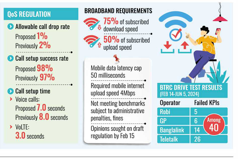 The Bangladesh Telecommunication Regulatory Commission (BTRC) has proposed stricter Quality of Service (QoS) standards for mobile-phone operators and internet service providers (ISPs), introducing the provision of fines for non-compliance under the Bangladesh Telecommunication Regulation Act 2001.