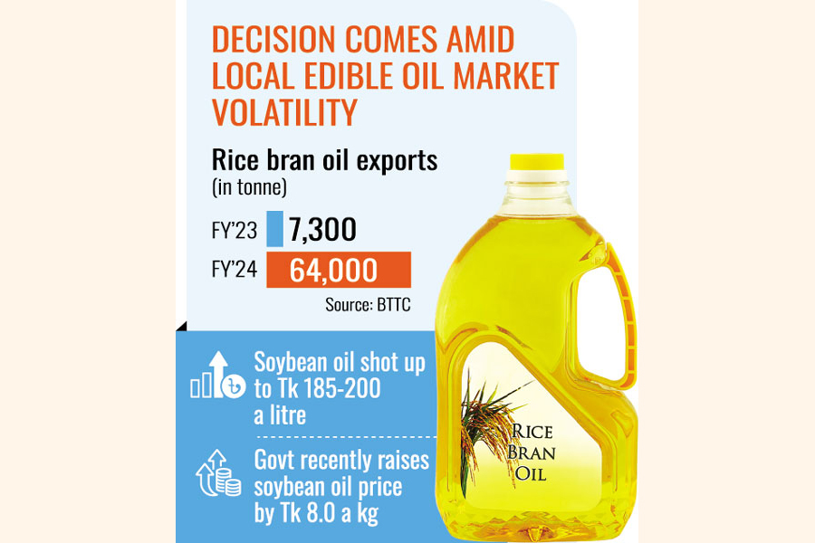 Over the past one and a half years, private companies exported more than 64,000 tonnes of rice bran oil, especially during the period when soybean oil prices soared to as high as Tk 200 per litre.