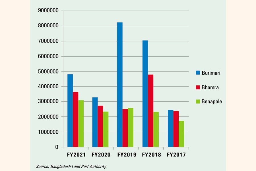 According to the BLPA, the country's northern frontier Burimari land port authority handled 4.78 million tonnes of goods for export and import in the fiscal year 2021 (FY2021).