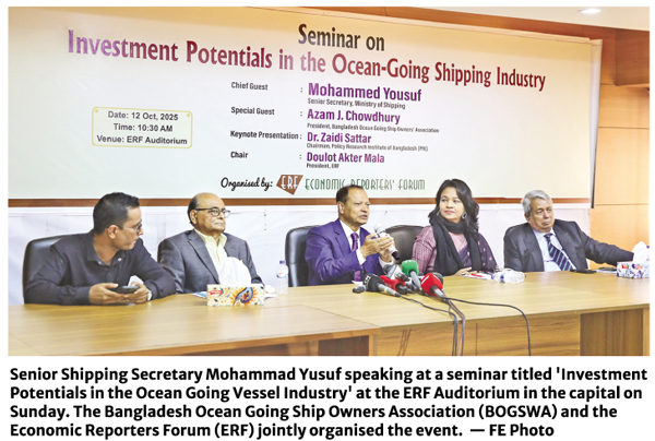 The seminar was organised jointly by the Bangladesh Ocean Going Ship Owners Association (BOGSOA) and Economic Reporters Forum (ERF) at the ERF Auditorium in the city.