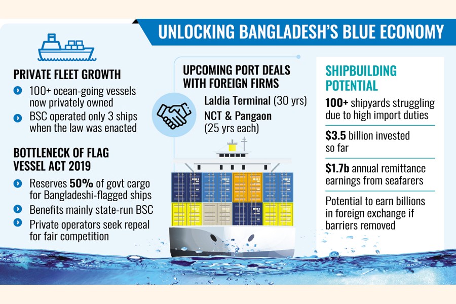 Industry leaders have called for abolishing the outdated Bangladesh Flag Vessel (Protection) Act 2019 to unlock the 'vast potential' of oceangoing shipping and shipbuilding sectors.