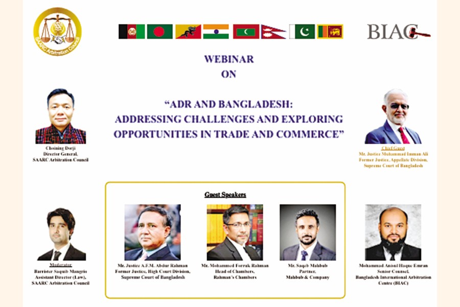 In a significant effort to promote Alternative Dispute Resolution (ADR) as a cornerstone of economic development and legal reform, the SAARC Arbitration Council (SARCO), in collaboration with the Bangladesh International Arbitration Centre (BIAC), hosted an insightful webinar titled 'ADR and Bangladesh: Addressing Challenges and Exploring Opportunities in Trade and Commerce' recently.