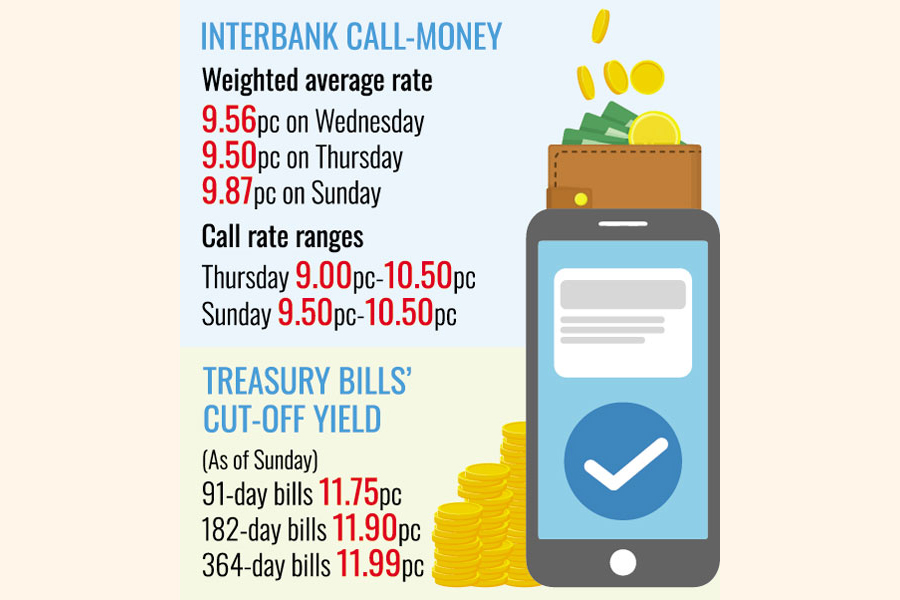However, the total turnover on the interbank call-money market rose to Tk 45.07 billion on Sunday from Tk 42.87 billion on the previous working day. It was Tk 31.50 billion on Wednesday last.