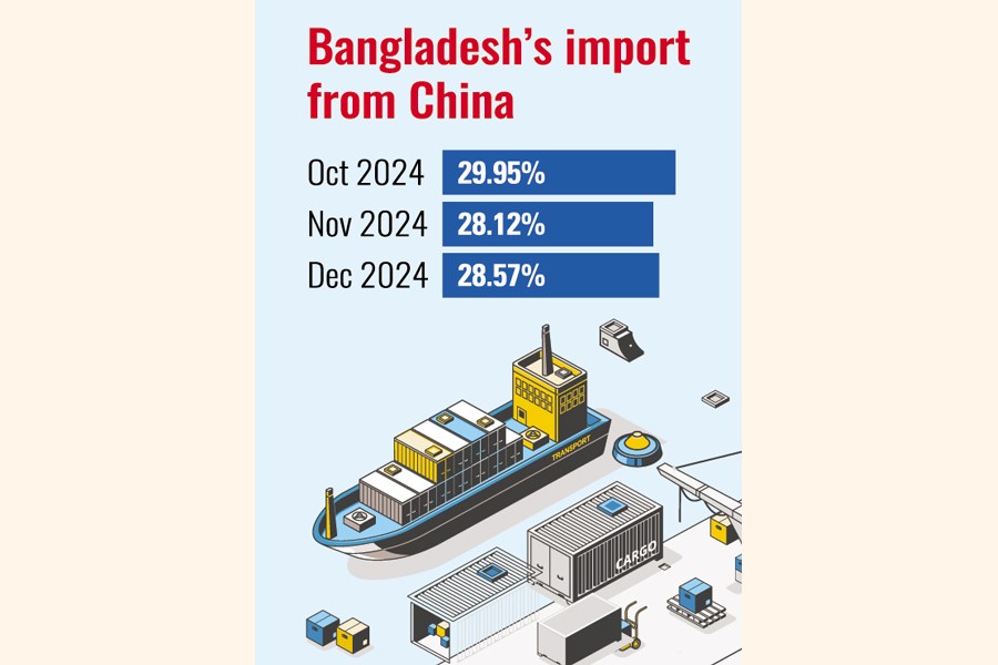 In December 2024, China accounted for 28.57 per cent of Bangladesh's total imports -- up by 5.51 percentage points from the same month a year earlier.